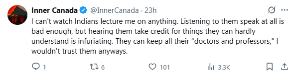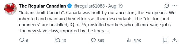 한 네티즌은 심지어 매우 인종차별적인 표현을 사용하여 조롱하기도 했습니다. “캐나다는 우리 조상인 유럽인들에 의해 건국되었습니다. 그들의 후손으로서 우리는 그들의 업적을 계승하고 이어왔습니다. ‘의사와 엔지니어’는 IQ가 76에 불과한 저숙련 노동자로, 저임금 직업에 종사합니다. 그들은 자유당이 도입한 새로운 노예 계층입니다.”
