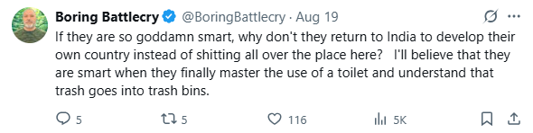 “네가 그렇게 똑똑하다면, 여기서 오줌과 대변을 싸는 대신 인도로 돌아가서 네 나라를 개발하는 게 어때? 네가 마침내 변기를 쓰는 법을 배우고 쓰레기는 쓰레기통에 버려야 한다는 걸 깨달을 때쯤이면 네가 똑똑하다는 걸 믿을 거야.”