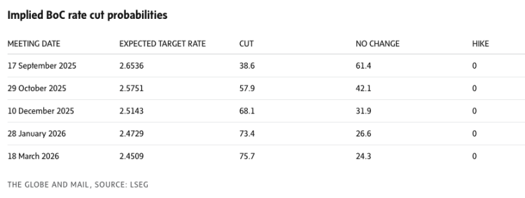 시장은 여전히 연말까지 0.25%포인트의 금리 인하를 예상하고 있습니다. 캐나다 중앙은행은 지난 세 차례의 회의에서 금리를 2.75%로 동결했습니다.