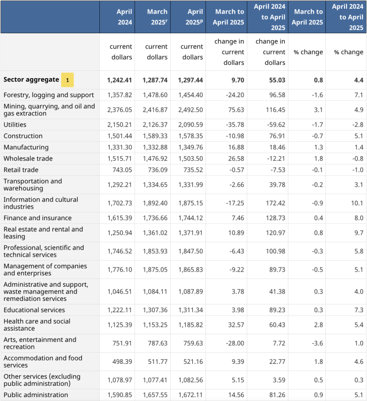 정부 기관은 목요일 4월 급여, 고용, 소득 및 근무 시간, 그리고 구인 현황 보고서를 발표했는데, 캐나다 국민의 주당 평균 소득은 1,297.44달러로 작년 4월보다 4.4% 증가했습니다. 4월 주당 평균 임금 또한 3월보다 9.70달러 상승했습니다.