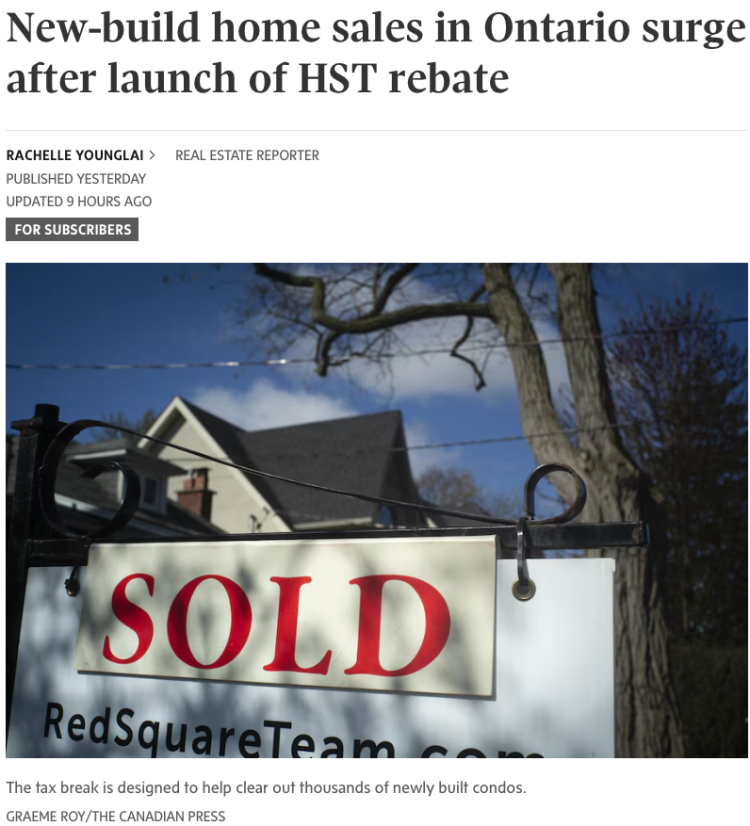 캐나다 글로브 앤드 메일(Globe and Mail)의 보도에 따르면, 온타리오주에서 신규 주택 구매 시 HST의 13%를 환급해 주는 정책이 시행된 첫 주에, 주택 구매자들이 앞다투어 주택을 매입했고, 많은 건설사들도 문의 전화를 쇄도했다.