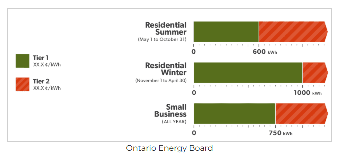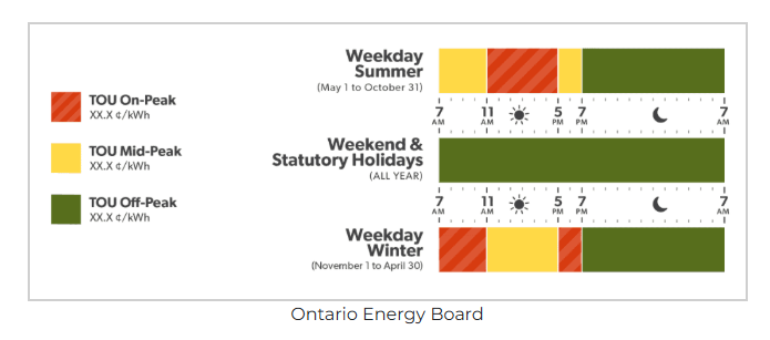 온타리오 에너지 위원회(OEB)에 따르면, 규제 요금제(Regulated Price Plan)에 가입한 고객은 일반적으로 시간대별 요금제(Time-of-Use), 초저가 야간 요금제(Ultra-Low Overnight), 그리고 단계별 요금제(Tiered) 등 세 가지 요금제 중 하나를 선택할 수 있습니다. 그중 대다수의 가구는 여전히 시간대별 요금제를 사용하고 있습니다.