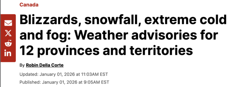캐나다 환경청은 새해 첫날 거의 모든 주와 준주에 기상 경보를 발령했습니다. 공식 발표에 따르면, 캐나다 여러 지역에서 눈보라, 폭설, 극심한 추위, 강풍, 짙은 안개 등 여러 가지 극한 기상 현상이 발생할 것으로 예상됩니다.