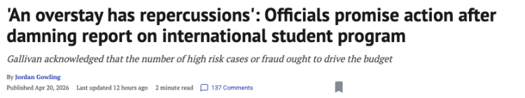 캐나다 감사원장 카렌 호건(Karen Hogan)이 지난달 발표한 보고서에 따르면, 2023년부터 2024년 사이 캐나다의 각 대학 및 전문대학에서 총 약 15만 3,000건의 유학생 규정 위반 사례가 보고되었으나, 이민 당국은 이 중 약 4,000건만 조사할 예산이 배정된 것으로 나타났다.