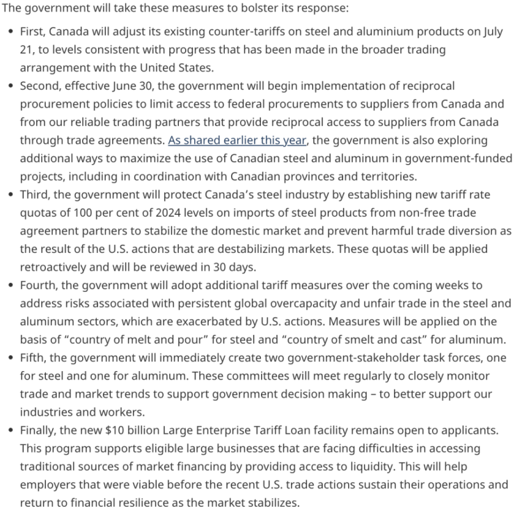 1. 캐나다는 7월 21일 미국과 체결된 광범위한 무역 합의의 진전에 맞춰 철강 및 알루미늄 제품에 대한 기존 상계관세를 조정할 예정입니다. 카니 총재는 오늘 조정된 관세율을 구체적으로 밝히지 않았습니다. 7월 21일은 카니 총재와 트럼프 대통령이 G7 정상회의에서 회담 후 발표한 30일간의 무역 합의 기간이 종료되는 날과 일치합니다.