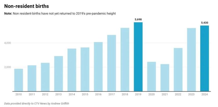 자료에 따르면 캐나다의 비거주 신생아 수는 2019년에 5,698명이었으며, 팬데믹 기간 동안 감소했다가 2024년에 5,430명으로 다시 증가했습니다.