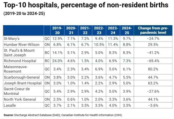상위 10개 병원 중 4곳이 온타리오주에 있으며, 모두 광역 토론토 지역에 위치해 있습니다. 이 병원들의 비거주 신생아 비율은 현재 팬데믹 이전 수준보다 훨씬 높습니다.
