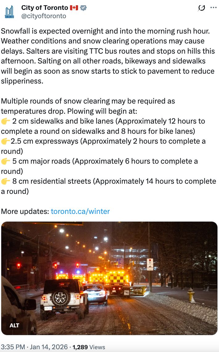 토론토시는 소셜 미디어를 통해 수요일 오후에 다가오는 눈에 대비하여 TTC 버스 노선과 언덕길 정류장에 소금을 뿌릴 예정이라고 발표했습니다.
