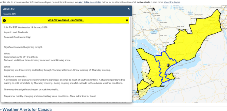 온타리오 환경청은 온타리오주 남부 전역에 황색 눈 경보를 발령했으며, 토론토에는 저기압의 영향으로 온타리오주 남부 지역 대부분에 폭설이 내릴 것이라는 기상 경보를 발령했습니다.