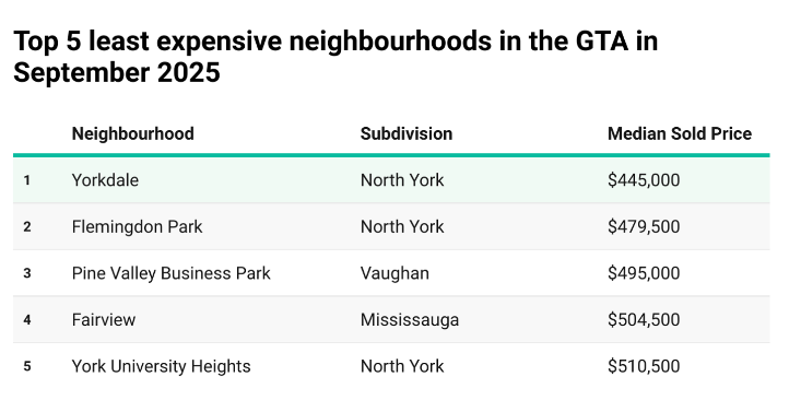 와히의 조사에 따르면 토론토 지역에서 주택 가격이 가장 낮은 지역은 노스 요크의 요크데일 커뮤니티로, 평균 주택 가격은 캐나다 달러로 445,000달러에 불과합니다 .