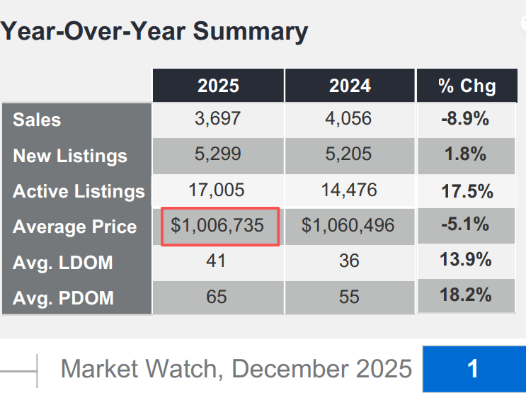 2025년 연평균 매매가는 1,067,968 캐나다 달러로, 2024년의 1,120,241 캐나다 달러보다 4.7% 감소했습니다.