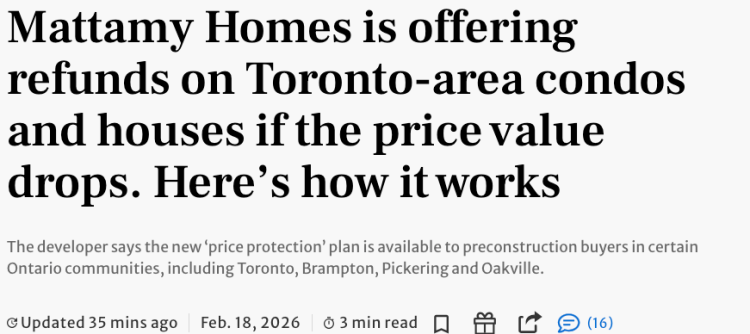 토론토 개발업체가 매매 계약 체결 시 가격이 하락할 경우 구매자에게 환불해주는 가격 보호 프로그램을 출시했습니다.