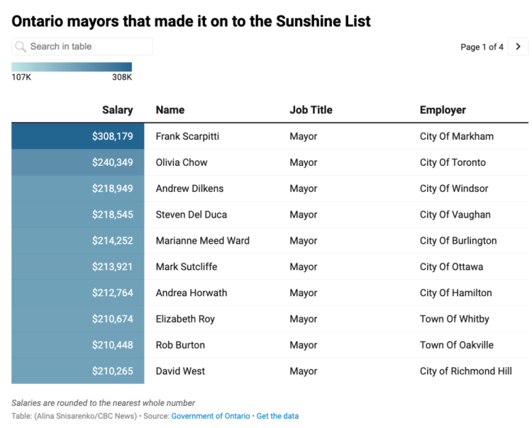 가장 높은 연봉을 받은 시장은 마크햄 시장인 프랭크 스카르피티로, 그의 연봉은 30만 8179달러였다.