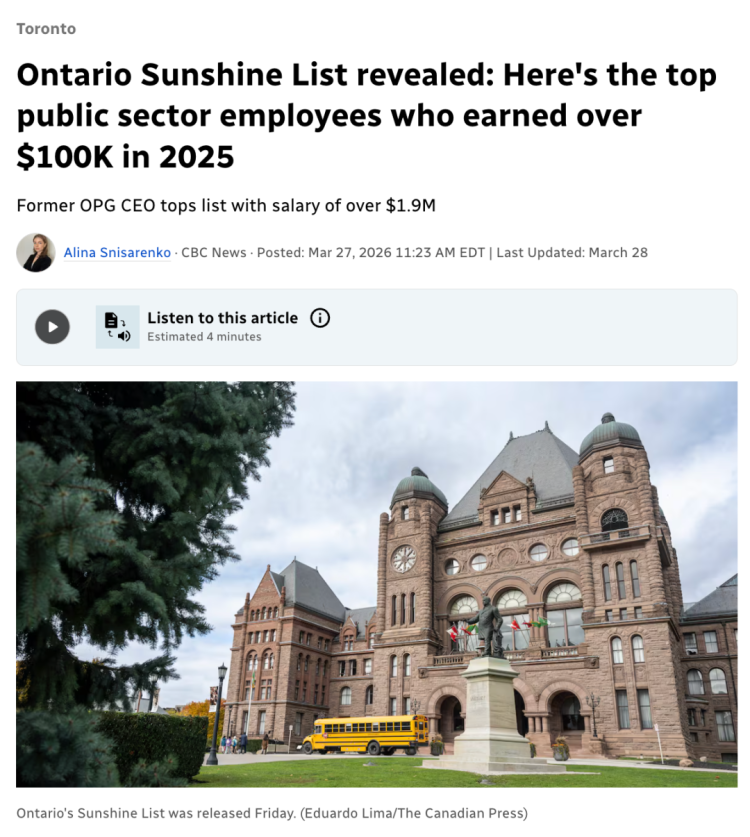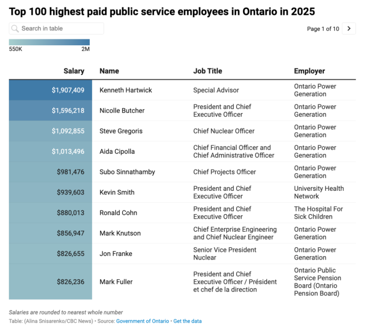 2025년에 온타리오에서 10만 캐나다 달러 이상을 받는 고액 연봉 공공 부문 직원 명단이 공개되었는데, 정말 엄청난 고액 연봉자들이 많네요!