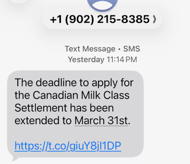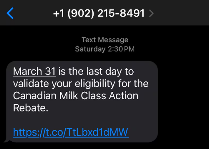코츠는 최근 우유 관련 집단 소송 합의를 가장한 피싱 문자 메시지를 받은 여러 캐나다인 중 한 명입니다. 메시지 내용은 약간씩 다를 수 있지만, 모든 메시지는 피해자에게 환불 처리를 위해 개인 정보와 신용카드 정보를 요구하는 웹사이트로 연결되는 링크를 클릭하도록 유도합니다.